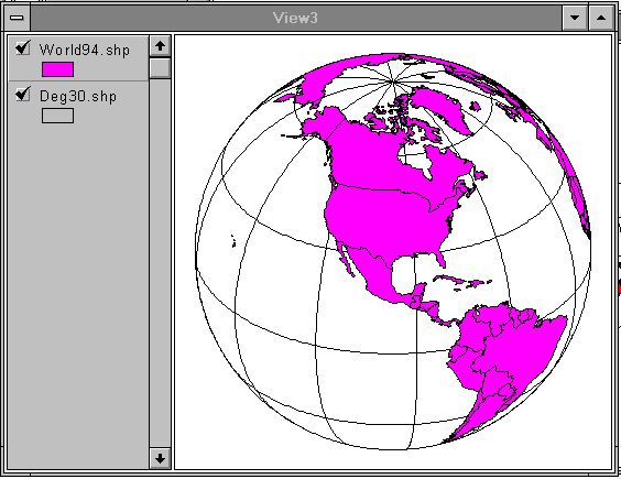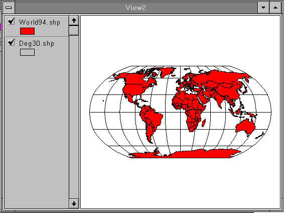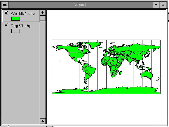 Make a new View by hitting New in the Project window while the View icon is highlighted. This should result in the creation of a new View window labeled View2. Add the themes World94.shp and Deg30.shp as before.