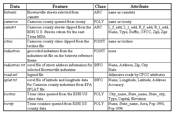 Due to cost and software application considerations, the ESRI Street database was selected for use in this project. U.S. Streets contains interstate, U.S. and state highways, other major thoroughfares and all local streets within the United States. This data later is advertised to overlay accurately on other boundary data, although it did not match exactly with the county files' boundaries. The nationwide street database is based on the Geographic Data Technology (GDT) Dynamap/1000 street file, an improved version of census TIGER data.The addresses for the Brownsville industries were taken from the Brownsville Chamber of Commerce Manufacturing Directory and entered into an Excel file. The excel file was imported into ArcView as a Table. (Note: the file needed to be saved as a .txt file to ensure the data did not get truncated). Those industries used for the exercise were chosen for their ease in geocoding.