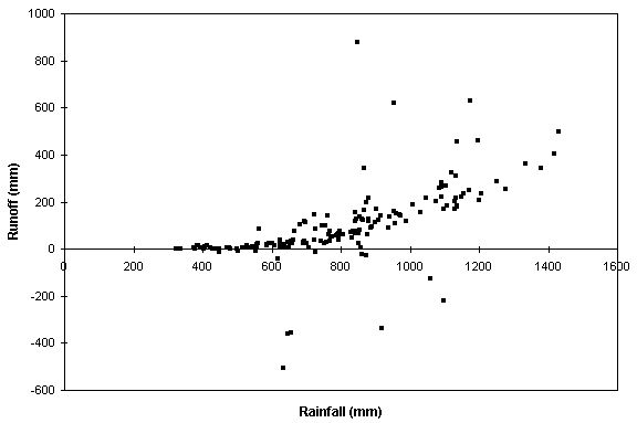 rainfall-runoff function by plotting mean annual runoff per unit