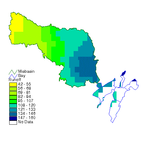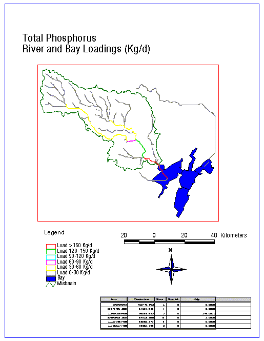 Look at the table, and in particular, the wnp field. This shows you the amount of nonpoint source pollution which enters the bay (Kg/d). From here, the Avenue script Balance can be run to show how the concentration of the constituent in the bay changes due to this loading. Information about Balance can be read at the Internet Site http://www.ce.utexas.edu/prof/maidment/GISHydro/ferdi/research/balance/balance.html. and on this GISHydro97 CD-ROM in the GH-Quality Module