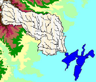 This part of the procedure includes a flow accumulation. In order to perform this, the river system needs to be connected to the bay system. This will allow for the nonpoint source pollution to be picked from a centroid in the bay polygon coverage. You will use the script connect.ave to do this. This script drops the elevation of the bays below the elevation of the adjacent land surface. The centroids of the bays are then dropped further so the flow accumulates at the centroid. The values can then be picked from the centroids.