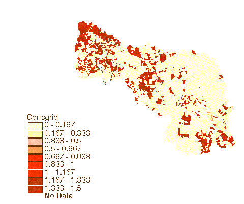 We will now convert the land use theme to a equivalent grid showing the Total Phosporus concentrations in mg/l over the landscape. The Avenue script concgrid has been written for you to calculate the new grid. The new grid will be similar looking to the EMC coverage just shown, however it will be a grid rather than a coverage.