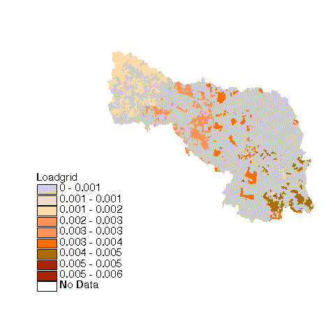 The loadings grid is found by multiplying the concentration grid by the runoff grid. The Avenue script loadgrid has been written for you to calculate the annual nonpoint source land surface loadings grid. This grid could be used to add in point sources and atmosphic deposition. However, for this assignment we will only deal with the land surface loadings.