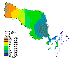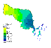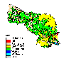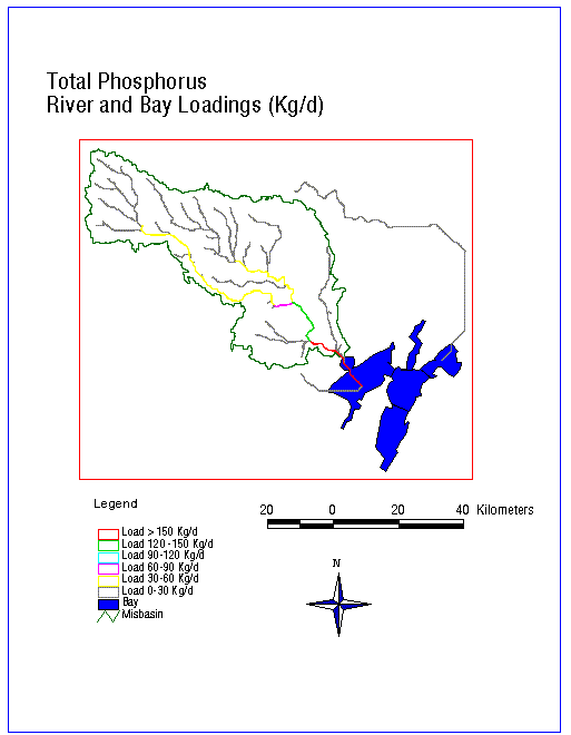 Notice the large area in the north-east of the basin that contributes 0 mg/L of Total Phosphorus. This corresponds to forest and rangeland land uses which don't contribute much phosophorus to runoff because fertilizers are applied to this land and it is not disturbed by land cultivation. The main nonpoint source of phosophorus is from the agricultural lands in the South side of the basin. There can also be significant point sources of phosophorus from municipal treatment plant effluent.