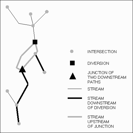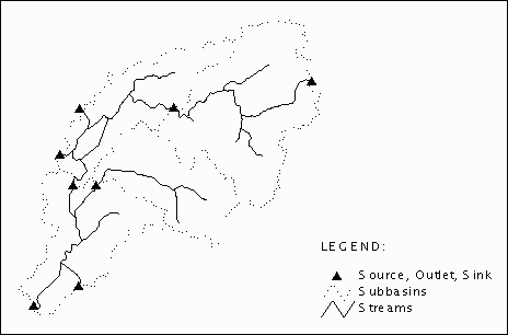 The stream layer is intersected with the subbasin layer to produce a new layer containing only those streams within the watershed as shown in Figure 2.2. This process removes streams outside the watershed and identifies the intersection of streams and subbasin boundaries. The intersections represent the locations of sources, subbasin outlets or sinks. The intersections are marked with solid triangles in Figure 2.2.