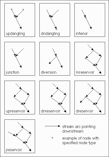 Node Type Description unknown unknown none none updangling a node at the upstream end of a dangling line. dndangling a node at the downstream end of a dangling line. interior a node connecting two lines pointing in the same direction (a pseudo node). junction a node which has multiple lines pointing towards it and one line pointing away. diversion a node which has multiple lines pointing away from it and one line pointing towards it. mreservoir a node connecting two lines along a reservoir pointing in the same direction (a pseudo node). mpreservoir a node at the most upstream end of a reservoir dnreservoir a node at the downstream end of a reservoir. dreservoir a node at a reservoir diversion. jreservoir a node at a reservoir junction.