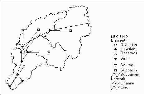With all the channel elements established and connectivity identified, a symbolic layer is generated showing the schematic model of the flow network, as shown in Figure 2.7. The lines in the layer represent connections among hydrologic elements. A connection can be via a reach (heavy lines) or a link (light lines) from a subbasin to its outlet. The nodes in the coverage represent connections between channel elements. Channel elements can be diversions (hollow circles), junctions (solid circles), reservoirs (hollow triangles), sinks (upside-down solid triangles), sources (upside-down hollow triangles), and subbasins (rectangles). Note that elements previously classified as subbasin outlets are now combined with junctions, because in the hydrologic data structure they both serve as flow summing points.
