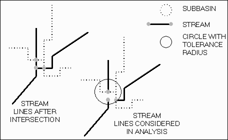 If a stream location theme (intheme, ftheme) was specified as input data (infound, boolean) the points in that theme are also checked. If a point exists within the tolerance distance (tol, number) of the new point the attribute values of the point in the stream location theme (intheme, ftheme) are written to the attribute fields of the point in the hydro point theme (hptheme, ftheme).