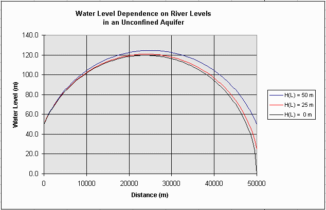 Things To Do: Prepare a graph of the piezometric head profile in the aquifer like the one shown above for the three cases for H(L). What proportion of the flow goes to the left as compared to the right hand river for each of the cases?
