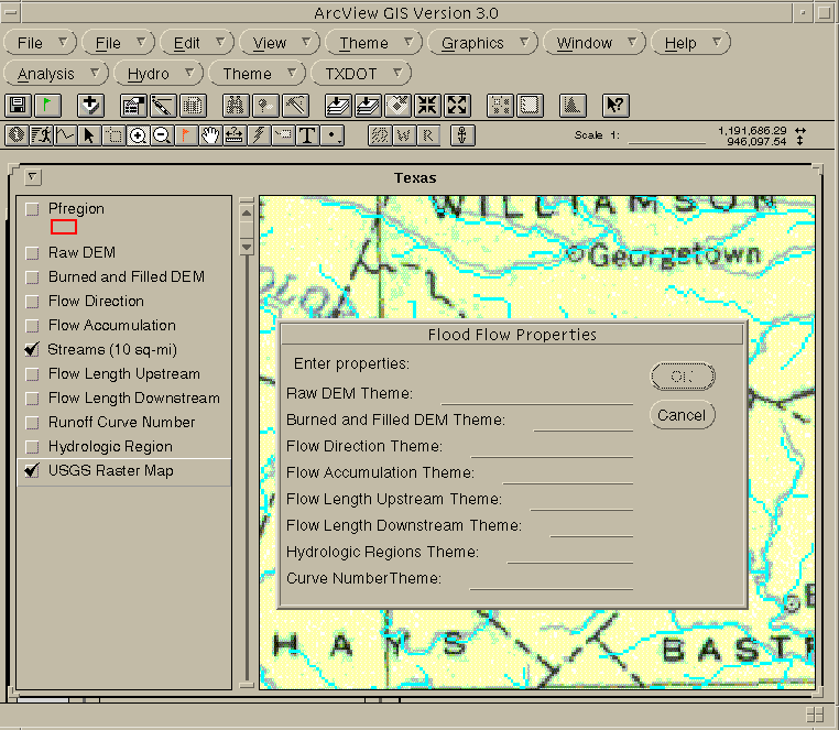 By clicking on TXDOT/Properties a dialog box called Flood Flow Properties pops-up (see Figure 3). All the empty slots should be filled with the name of the grid theme (not necessarilly the name of the grid) according to the following guidelines: