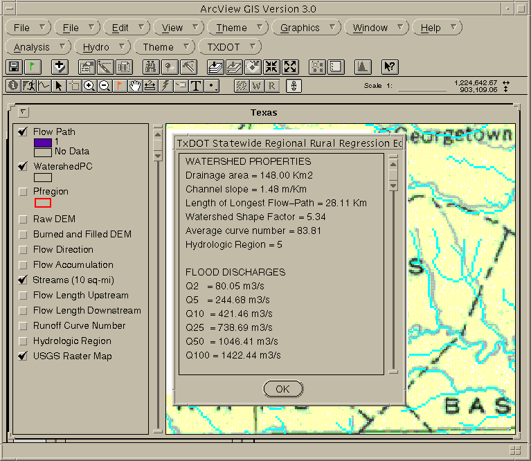 An ArcView extension for estimating watershed parameters and peak discharges, according to the TxDOT Statewide Regional Rural Regression Equations, has been developed.