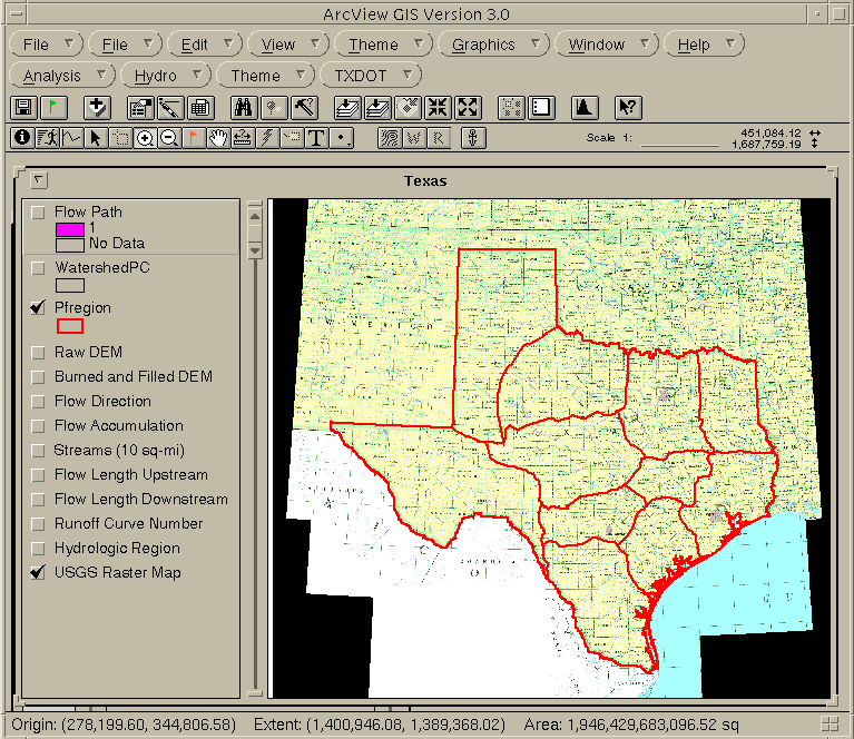 Figure 1: ArcView window displaying the USGS raster map image, and the hydrologic regions coverage for the entire State of Texas.