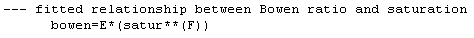 Click OK to the "User Input" window and then No. You will now be prompted with a window titled "Fitted Equation Input." The numbers that you see are parameters used to fit equations to the Bowen ratio vs. soil saturation and runoff coefficient vs. soil saturation curves. These equations have the following form: