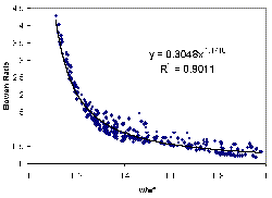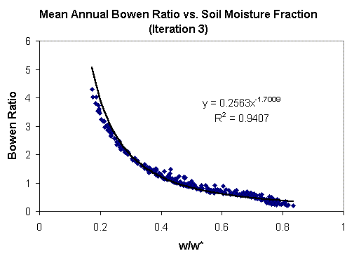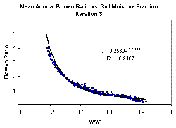 Er is the radiation equivalent in depth of liquid water and B is the Bowen ratio. Because this method relies on computed soil moisture values, the relationship between Bowen ratio and soil saturation will change when this new method is implemented because new soil moisture values will be computed in each cell. For this reason, an iterative procedure in which the soil-water budget computations are repeated for each cell (using the new functional relationship) to see how the Bowen ratio versus soil saturation relationship changes. This relationship became tighter after only a few iterations. The curve that resulted after three iterations is shown below. The relationship shown here is what is used in the calculations below.