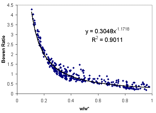 The hypothesis being tested is whether this relationship derived from a steady-state values at different points in space can be applied to time-varying calculations at individual locations. During the soil water budgeting calculations, an estimate of soil saturation is available at each step so the Bowen ration can be estimated using a graph like the one above. Then the amount of evaporation can be estimated using the following equation.