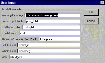 Don't change the names of the input files for precipitation or net radiation but you can change the names of the output files if you want to run several different cases and compare the results. Check the working directory to make sure that this is the location where you want files to be written.