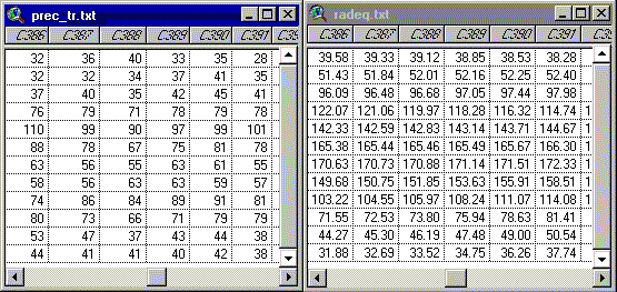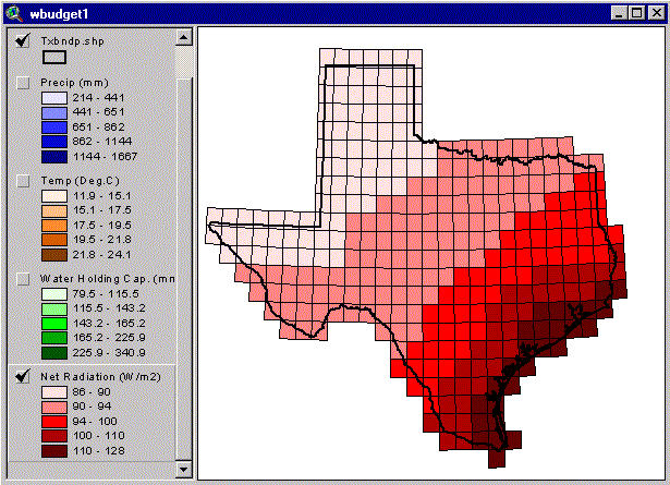 This file contains one record for each cell in Texas and monthly values are in Fields: 12 values of precipitation, 12 values of net radiation, 12 values of surplus, 12 values of evaporation, and 12 values of soil moisture. This format is a different than that created by the Avenue program and has both advantages and disadvantages. One advantage is that the output data can be joined (using the menu item Table / Join) directly to the polygon coverage for making maps. To do this, the two key fields that can be joined are "Cellid" in the table iter1out.txt and "txclimt_id" in Precip(mm).
