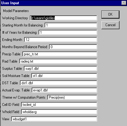 The Avenue script for computing the soil water balance is not a particularly efficient program. So when it was desirable to make repeated computations (with slight variations) over a large area, a FORTRAN program was used. The input file for this program is a text file created using an Avenue script.