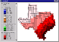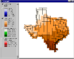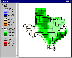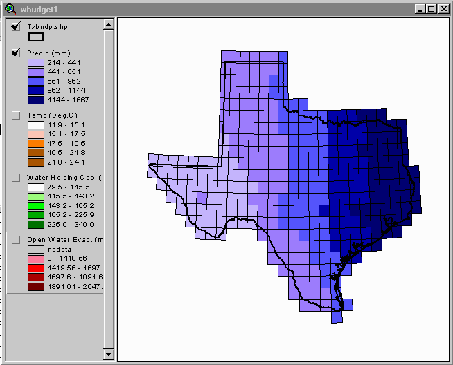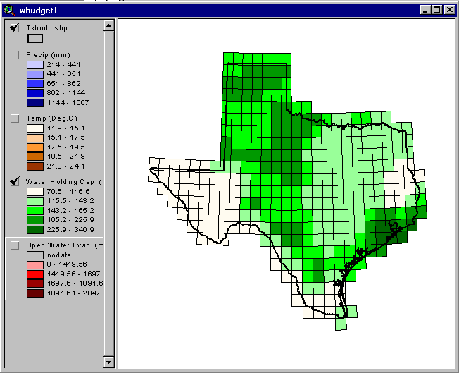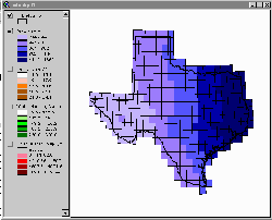 These water-holding capacity estimates have also been attached as an attribute to the coverage txrun2.shp. These values are contained in the field "whold." To view this data, remove the check mark next to the Theme "Precip" and check the box next to "Water Holding Cap".
