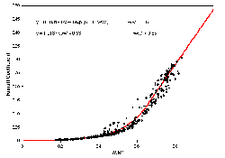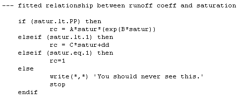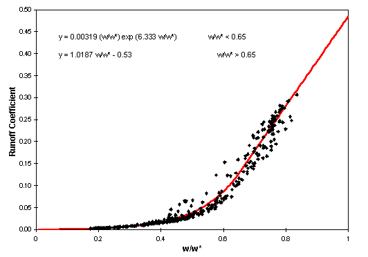 This is the relationship used in the sample calculations presented below. There is a notable problem with this relationship in that the fitted equation yields a runoff coefficient of about 0.5 when the soil is saturated, but in reality a runoff coefficient of 1 is expected when the soil is saturated. In the program used below, runoff coefficient of 1 was assumed whenever the soil became saturated.
