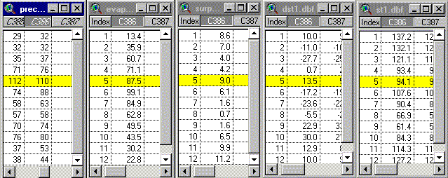 Four dBase files have been created by the script "swbaltx.ave" that was initiated when you selected "Run Soil Balance." "Surp1.dbf" contains computed surplus. "St1.dbf" contains soil moisture storage. "Dst1.dbf" contains change in storage, and "evap1.dbf" contains computed evaporation. Here is an example of the computation reuslts for cell C386: