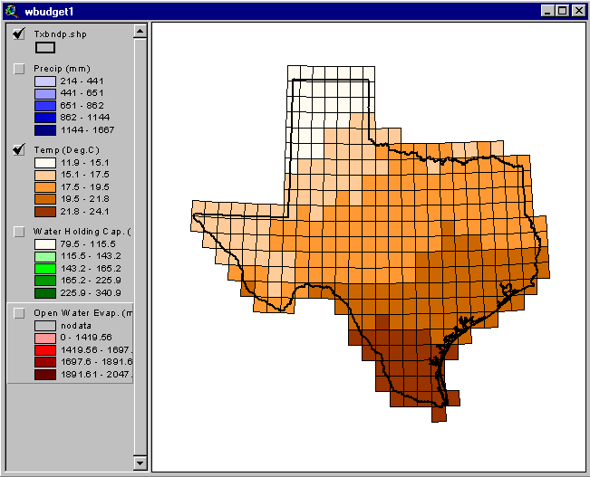 0.5 degree boxes covering the land surface of Texas have been clipped for use in this exercise. Mean annual precipitation and temperature estimates are attributes of the shapefile txrun2.shp: "wprec" and "wtemp." The Themes that you see called "Precip" and "Temp" both reference the file txrun2.shp.