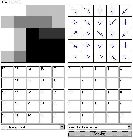 This applet is a grid calculator. It calculates the slope, flow direction, flow accumulation and weighted flow accumulation for an elevation and weight grid. A graphic of the current grid is displayed.