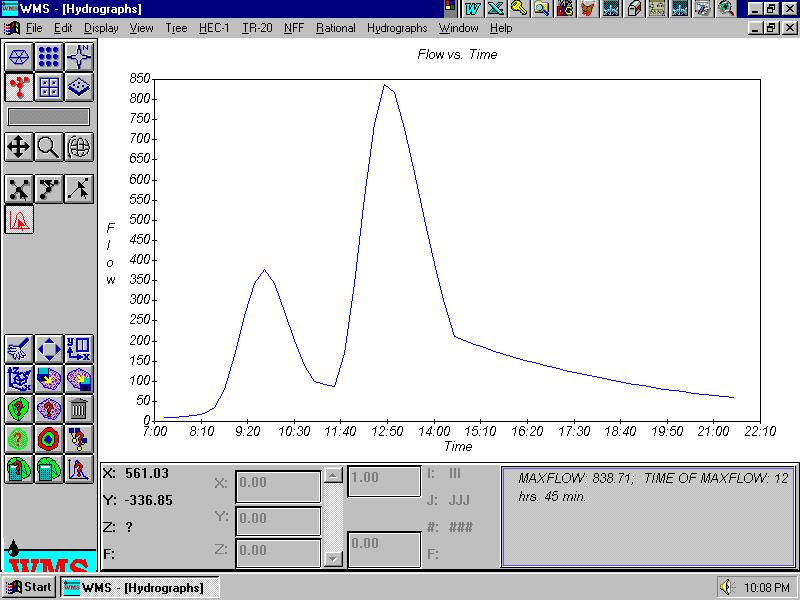 Once the HEC-1 input is done for the watershed, go to the HEC-1 menu and choose Job Control. Set the normal computational parameters for your HEC-1 run, and then again from the HEC-1 menu choose Check Model. The model checker will read the input file andl tell you if it finds any errors. Nice. This is a good point to save the files. The current beta version 5.0 of WMS cannot save imported grid data, but can save the HEC-1 file. Go to the File menu, select Save As and you will be prompted for a file name. HEC-1 input files are given the extension .hc1, output files are .out, and hydrograph Tape 22 files are given an .sol extension. If everything seems okay, from the HEC-1 menu choose Run HEC-1. A DOS window will appear and HEC-1 will run. Choose OK to exit this window when prompted. You now have a standard HEC-1 output file created, as well as a Tape 22 file for hydrographs. To look at the hydrographs, go to the Display menu and choose Show Hydrograph Window. From the Hydrographs menu, select Open. Choose the file you named as your HEC-1 Tape 22 file and click OK. Small hydrographs will appear on the map at all locations where hydrographs were computed. To see the hydrograph in the Hydrograph Window, simply click on it.