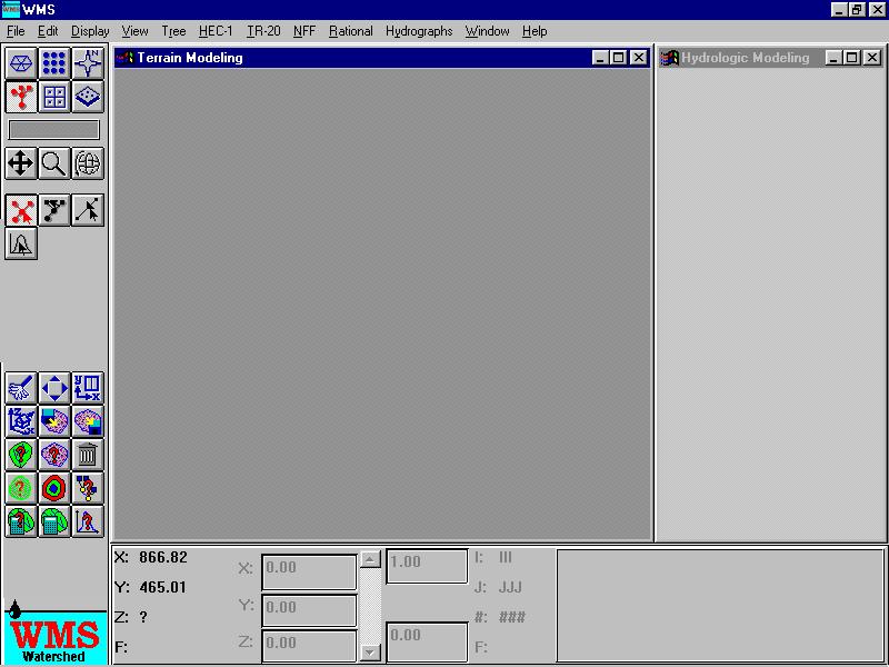 Allright, lets launch WMS. Double click on the WMS icon (or click the Watershed Modeling System icon in the WMS directory of the programs menu in Windows 95), and the following screen will appear: