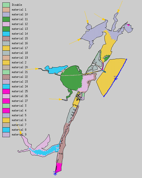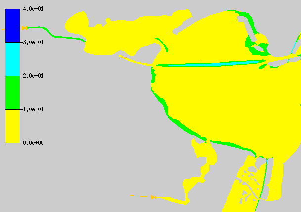 Material properties consist of Manning’s n values. The TxBLEND input data has Manning’s n values assigned to nodes. In TABS Manning’s n values are assigned to elements through material types. Each element was assigned a Manning’s n value equal to that of the majority of the three corner nodes. If all corner nodes had a different Manning’s n value the element was assigned a value equal to the first node. There is a maximum number of material types in TABS. For that reason the number of different Manning’s n values was reduced by rounding of one significant digit. This was done in Excel. Material properties are specified in the boundary conditions file with the EV card.