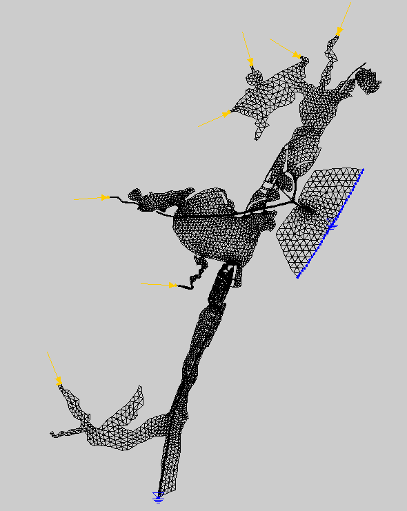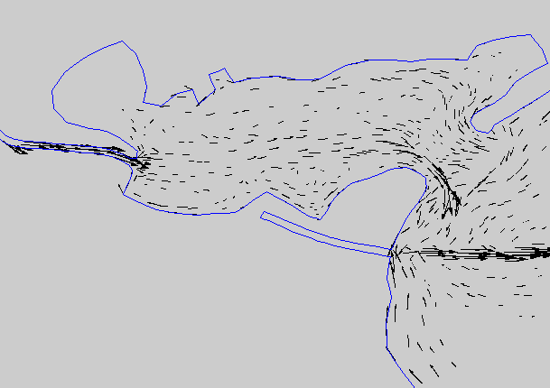 A steady state hydrodynamic model of the bay system was constructed. The model, which consists of over eight thousand triangular elements is constructed using TABS software distributed and maintained by the Waterways Experiment Station of the Army Corps of Engineers (Roig et. al., 1996). A graphical user interface called Surface Water Modeling System (SMS) ( Engineering Computer Graphics Laboratory , 1995) was used to pre- and post-process the data.