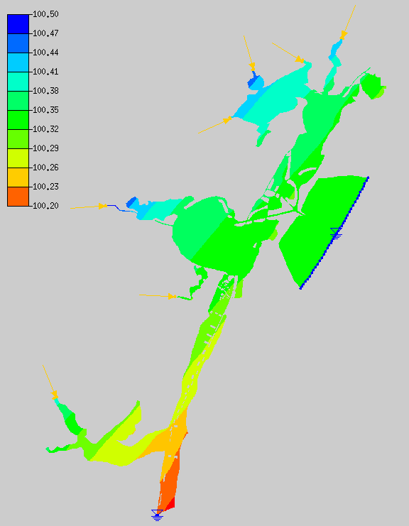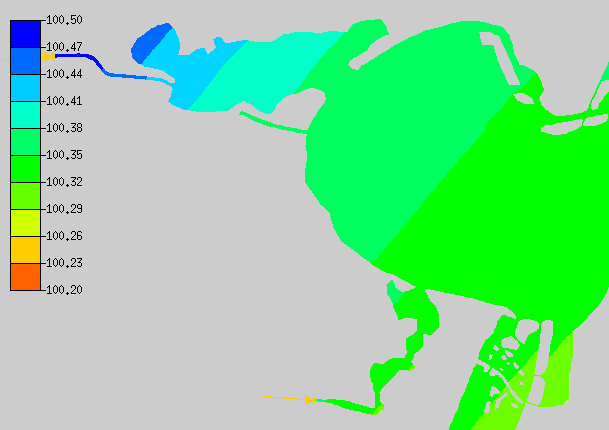 Water surface elevation (WSE) in the system is inclined with higher elevations inland. That inclination is due to the wind friction on the water surface. In Corpus Christi Bay, for example, the wind set up is 0.05 feet. If the case is simplified to a rectangular basin with uniform depth and no throughflow a solution can be found analytically. The wind set up for a rectangular basin 73,000 ft long and 12 ft deep subjected to the same wind is 0.04 ft. This compares well with the TABS solution.