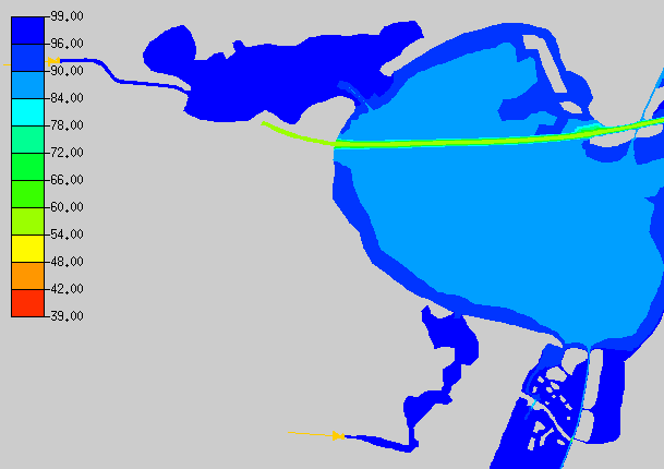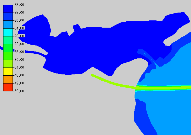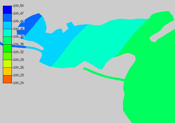 In the TxBLEND input data bottom elevations were given as depths. The TxBLEND input was converted to elevation values by subtracting the depths from a datum. An arbitrary datum was set at 100 feet below mean sea level. This was done to ensure only positive elevation values. The conversion was done in Excel. Bottom elevations are specified in the geometry file with the GNN card.