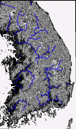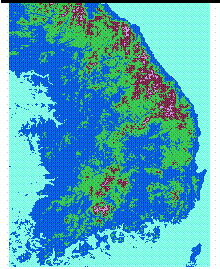 Grid : mape asia_dem3 Grid : gridpaint asia_dem3 Grid : setwindow * (Select the Korean region using a user defined box) Grid : kdem = asia_dem3(Create a new grid called kdem) Grid : clear Grid : mape kdem Grid : gridpaint kdem value linear nowrap grayWe get the GRID file of the Korean region, See Figure 1