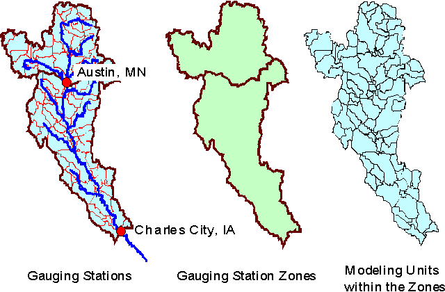 Figure 4.16 Cedar River watershed above Charles City, Iowa: An example of gauging station zones and modeling units.