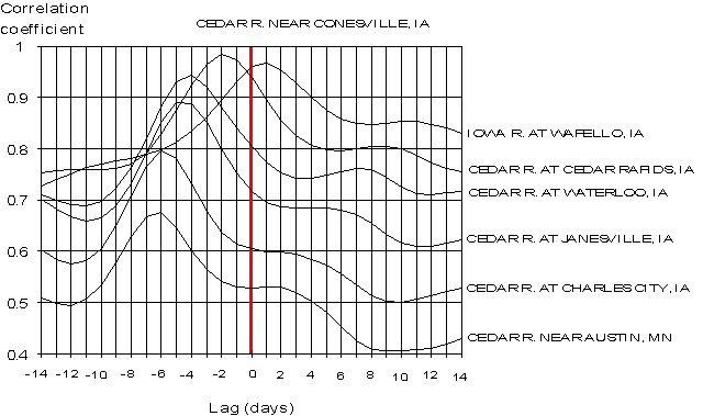Figure 4.19 Cross-correlation coefficients: the strength of the linear relationship between the flow rate in the Cedar River recorded near Conesville, IA, and the flow rate recorded at indicated locations. All gauging stations are on one flow path (shown in Figure 4.18).