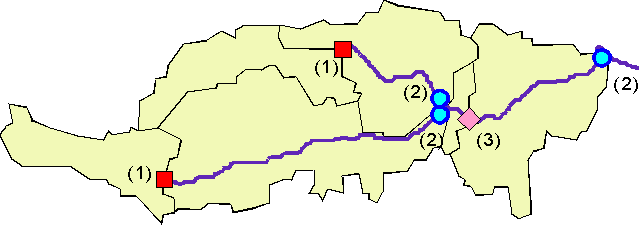 Figure 4.7 Example of watershed outlets: (1) beginning of the river, (2) stream junction, and (3) gauging station.