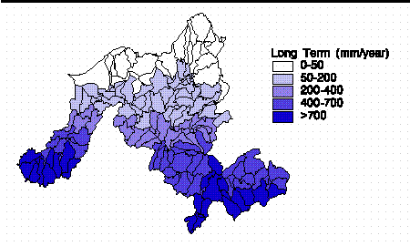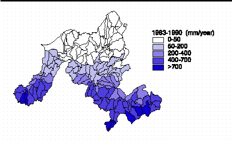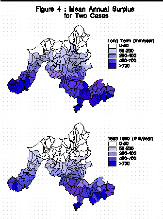 Basin-averaged values of "surplus" water were estimated for 167 sub-basins of the Niger River basin for two scenarios: long term average climatic conditions and conditions during a historical period (short term) representative of dry conditions, July 1983 to Dec. 1990. The phrases long term and short term will be used throughout the remainder of this document to refer to these two cases. Surplus is water which does not evaporate or remain in soil storage and includes both surface and sub-surface runoff.