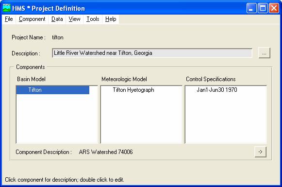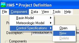 In the Components section of the Project Definition, there are three sub-sections--the Basin Model, the Meteorologic Model, and the Control Specifications. Each component represents a different element of the model. The Basin Model, for instance, contains information relevant to the physical attributes of the model, such as basin areas, river reach connectivity, or reservoir data. Likewise, the Meteorologic Model holds rainfall data. Finally, the Control Specifications section contains information pertinent to the timing of the model such as when a storm occurred and what type of time interval you want to use in the model. Each of the sections is explored below individually.
