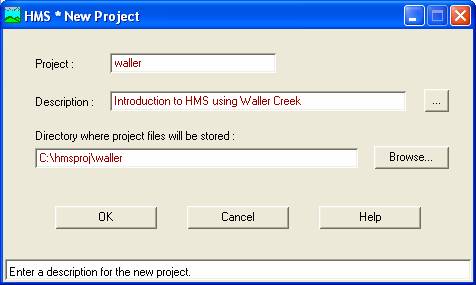 The first of the Components we will consider is the Basin Model. To create a hydrologic model of Waller Creek, we need to import the basin file that you just downloaded. In HMS Project Window, use File/New Project to open a new project by entering the following data. Notice that typing "waller" in the Project window automatically creates a subdirectory called waller in c:\hmsproj, which is where Project files are stored when HMS is executed.