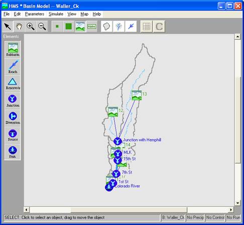 You should then see a schematic of Waller Creek showing the watershed and stream map and an overlay of the hydrologic elements.