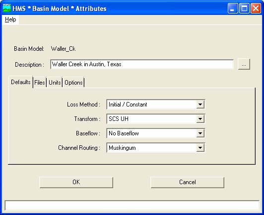 To access this window, select Basin Model Attributes from the File menu in the Basin Model window. The following window should appear: