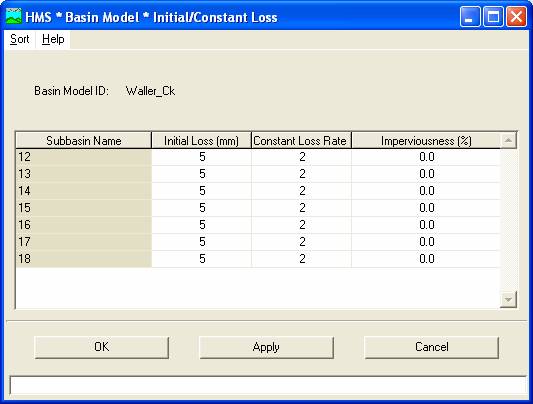 Note that while the Initial/Constant Loss Rate method was specified via another menu, it is in this table that the method parameters are actually entered. Each basin requires an initial loss quantity, a constant loss rate, and a percent imperviousness. These values have been selected arbitrarily. If the % impervious value differs from 0, that % of the land area is assumed to have no losses and the loss method is applied only to the remainder of the drainage area