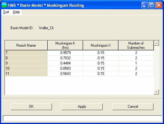The next step involves entering the parameters for the routing process. From Parameters/ Reach / Muskingum. This should cause the following image to appear. This simulation routes the water through the reaches by the Muskingum method in which K is the travel time of a flood wave passing through the reach, X is a measure of the degree of storage (X = 0 means a level-pool reservoir or maximum storage, X = 0.5 means a pure transmission reach in which there are no storage effects, and X ranges between 0 and 0.5). The reach is divided into a number of subreaches if necessary to keep the computations numerically stable.