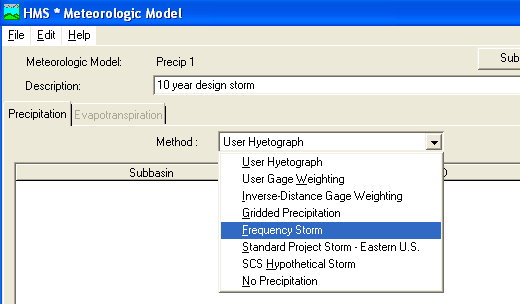 From the meteorologic model window, select Frequency storm for the User Hyetograph