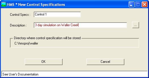 The final piece of the model setup involves establishing the model's time limits. Go back to the Project Definition and select Parameters/Control Specifications/New. The following window will appear in which you can label the specifications.