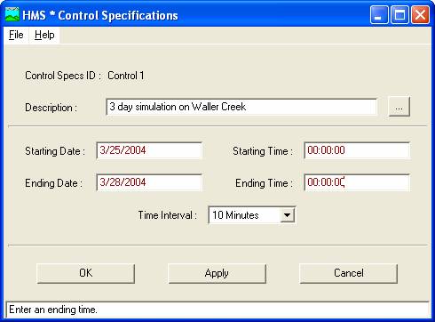 After you click Ok, you'll get the window to specify the duration of the simulation in date and time, and also the time interval of the calculations (10 minutes). In this case, the duration is arbitrary, long enough to depict the runoff from a 1-day storm, but the 10 minute time interval is part of the Basin file model setup and should remain fixed for this Waller Creek model.