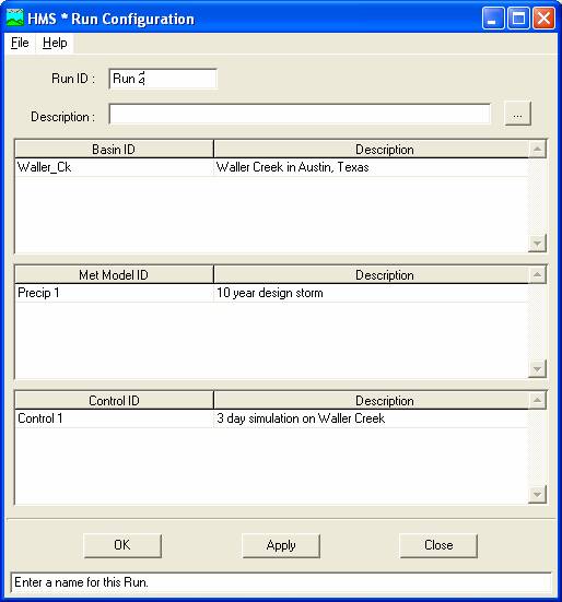 Run Configuration from the Simulate menu. The following window should appear. Click on each of the three boxes to highlight and select them, hit Add to record these as the files to be used for Run 2, and Close the window. The three subsections in this window list the physical, rainfall, and timing data sets that have been created for this project. Though this model only has one data set in each section, the HMS is slick in that it allows the user to have multiple data sets available to include conveniently in different runs.