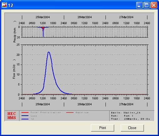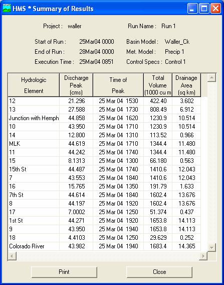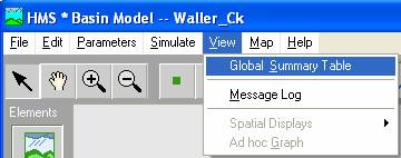 The HMS allows you to view results in tabular or graphical form. To view a global results table, go to the Project Definition and double-click WallerCk . From the window which appears (the Basin Model window), go to View and choose Global Summary Table. You'll get a window like that shown below which summarizes the peak discharge and time, the total volume of storm runoff and the drainage area from which it came.
