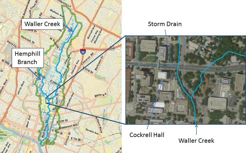 Here is a map of Waller Creek so you can see its relation to the University of Texas campus and to Cockrell Hall.